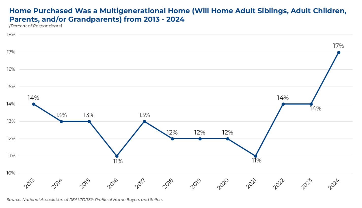 ”Over the past decade, a noticeable shift has occurred in the generational breakdown of multigenerational home buyers. Gen-X buyers, often referred to as “the sandwich generation” in the housing market, have increased their share of this market from 12% in 2013 to 21% today.