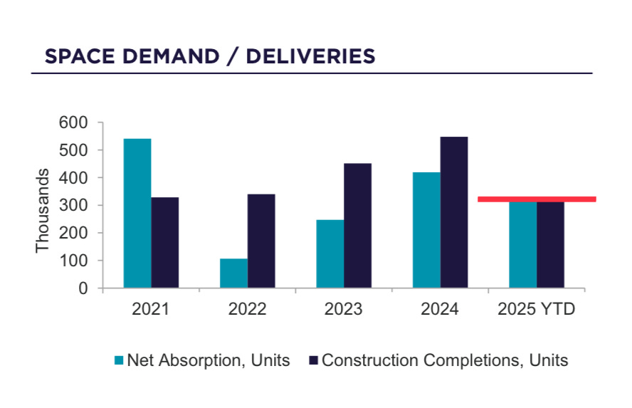The supply wave has crested. The third quarter brought 109,000 new deliveries, down 27% YOY. Estimates across all third-party data providers suggest quarterly deliveries will remain under 100,000 for the foreseeable future—signaling a meaningful slowdown in new supply.”
