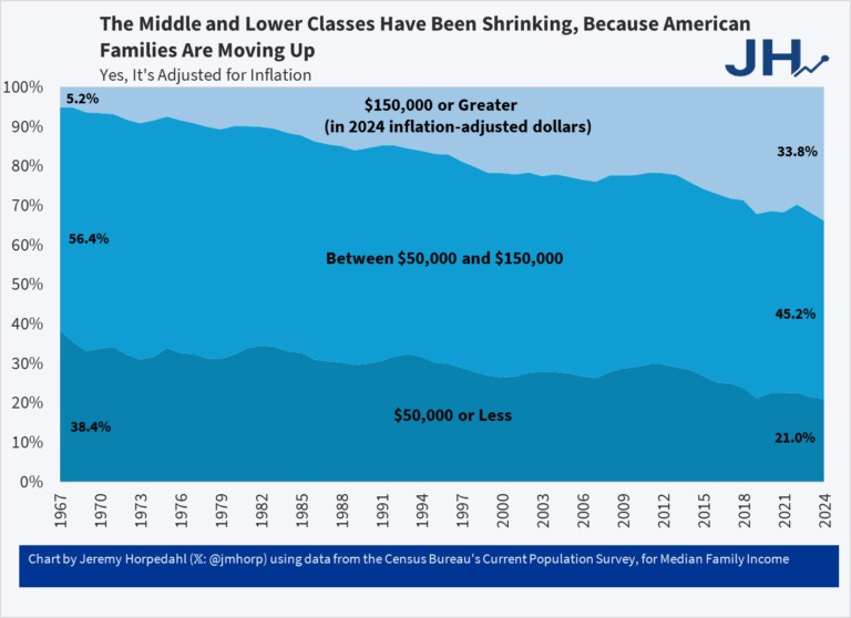 Scott Choppin Note: One interesting part of this change, is that while the upper class grew bigger, many lower class families moved into the middle class, i.e. everyone shifted upwards. Bottom line: the middle class is here to stay. Note that the calculation of wages are inflation adjusted, so this movement is NOT due only to inflation of nominal wages. This is bullish for the rental housing markets in the long run.